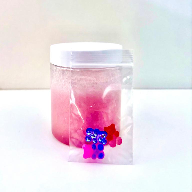 Soft, fluffy slime with 3 randomized gummy bear mix-ins!