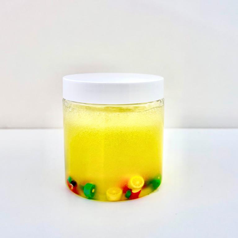 Bright yellow jelly slime with tropical fruit slices – bouncy, juicy, and totally addicting.